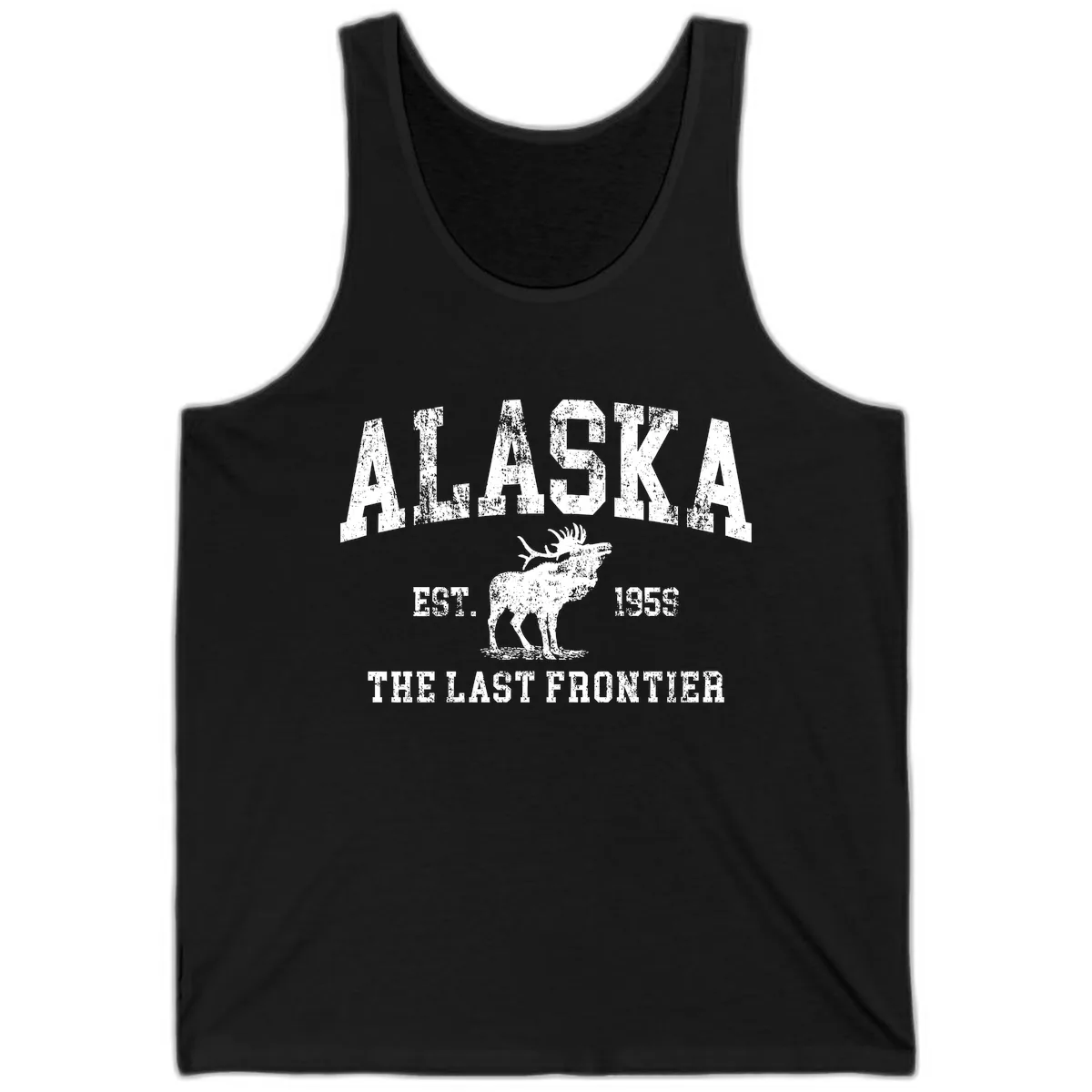 Soak up the sun (and the Alaskan views!) in this breezy tank top. It features a cool vintage moose silhouette and the classic 'ALASKA EST. 1959 THE LAST FRONTIER' text with a stylish distressed look. Perfect for warmer days on deck or layering under a jacket, this tank is your go-to for comfortable, vacation-ready style that celebrates the wild spirit of the Last Frontier.