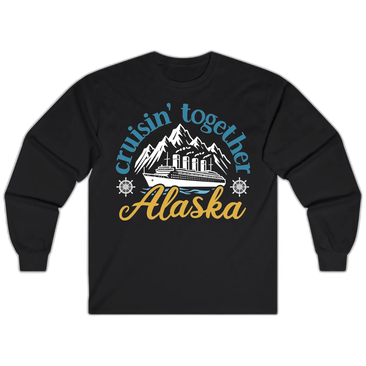 The 'cruisin' together' blue arch and gold script 'Alaska' text, along with the stylized waves, are printed clearly on the long sleeve. It makes a great statement piece for your cruise attire.