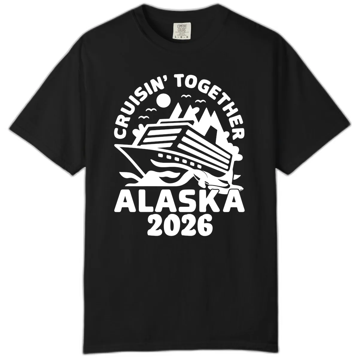 Make your 2026 Alaska cruise unforgettable with the "Cruisin' Together Alaska 2026 Scenic" Comfort Color T-Shirt. This tee features a captivating illustration of a majestic cruise ship sailing against a backdrop of dramatic mountains and a bright sun, perfectly symbolizing your group's epic adventure to the Last Frontier.