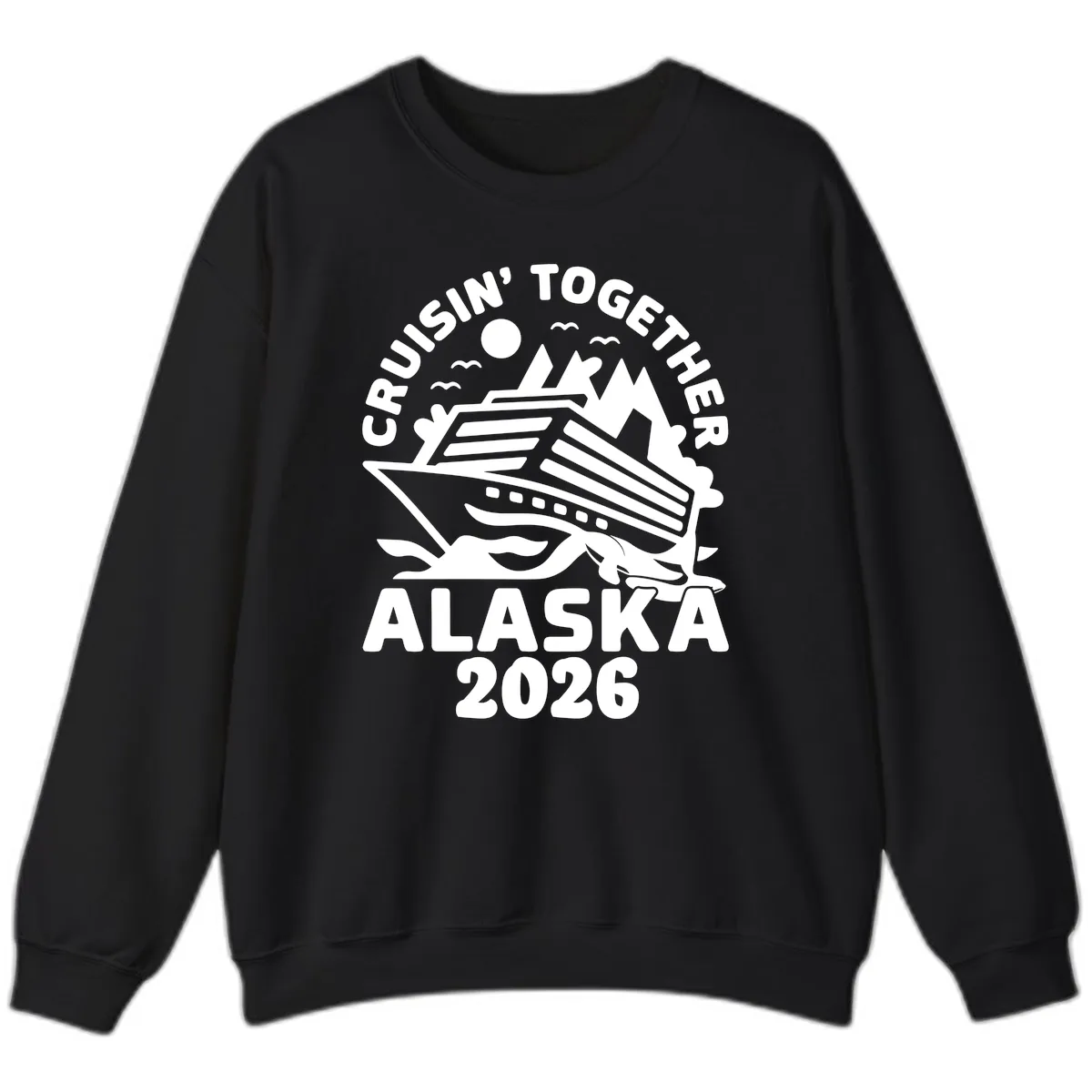 The 'CRUISIN' TOGETHER ALASKA 2026' design is printed on this cozy sweatshirt, featuring a white illustration of a cruise ship, mountains, and scenic elements, perfect for your group.