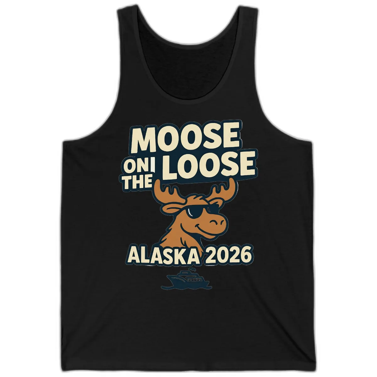 The 'MOOSE ON THE LOOSE ALASKA 2026' design, featuring the moose in sunglasses and the cruise ship, looks vibrant and fun on this casual tank top, making it a great conversation starter.
