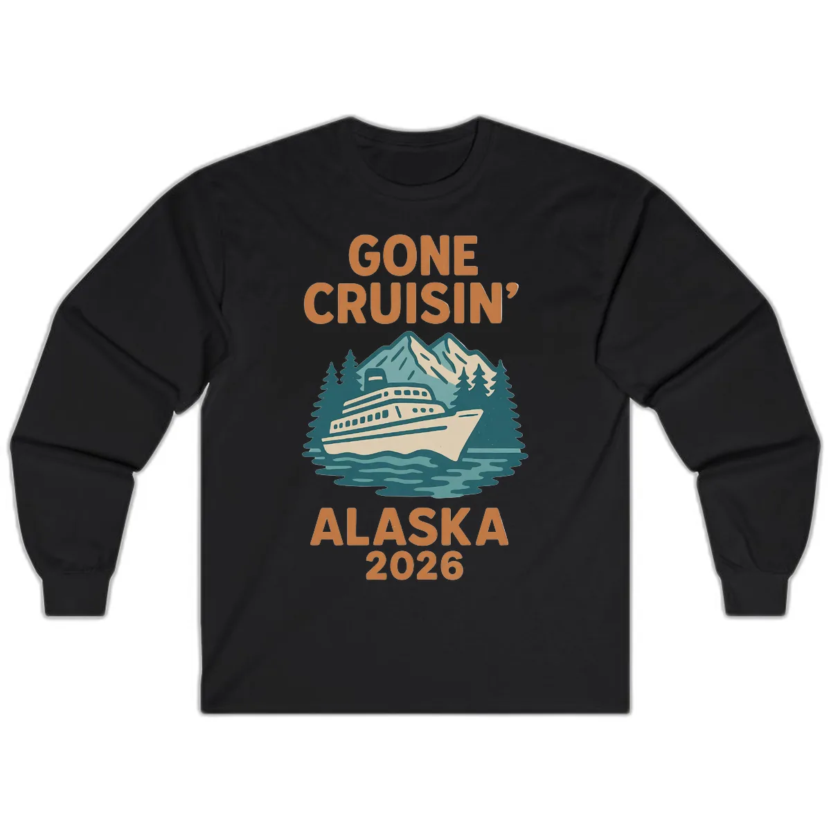 Yes, the scenic mountain ship illustration and the 'GONE CRUISIN' ALASKA 2026' text are prominently featured, making a bold statement on the long sleeves, perfect for capturing the essence of your trip.