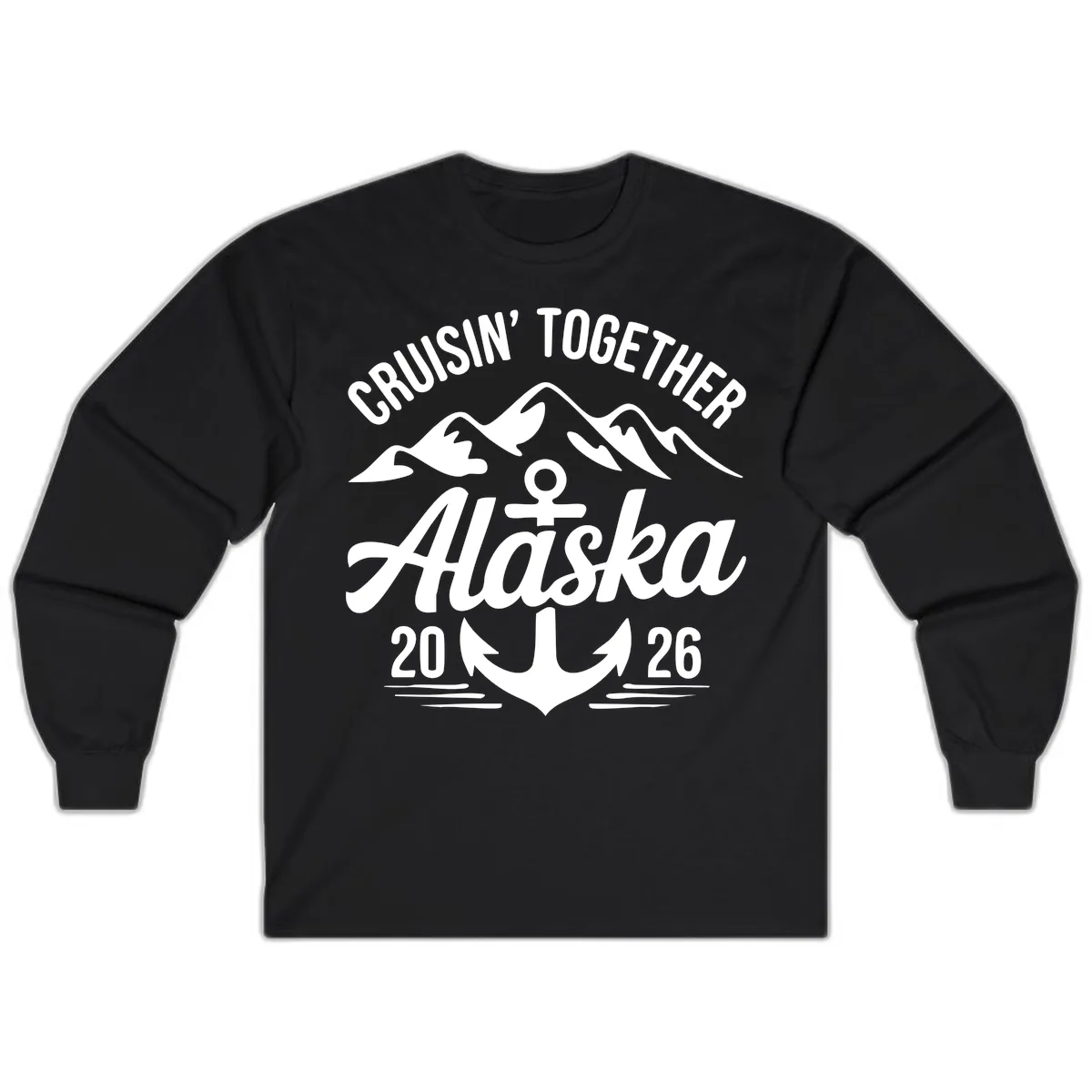 The 'CRUISIN' TOGETHER ALASKA 2026' text and the accompanying anchor, wave, and mountain graphics are printed in white against the black background of the long sleeve shirt, maintaining the design's bold impact.