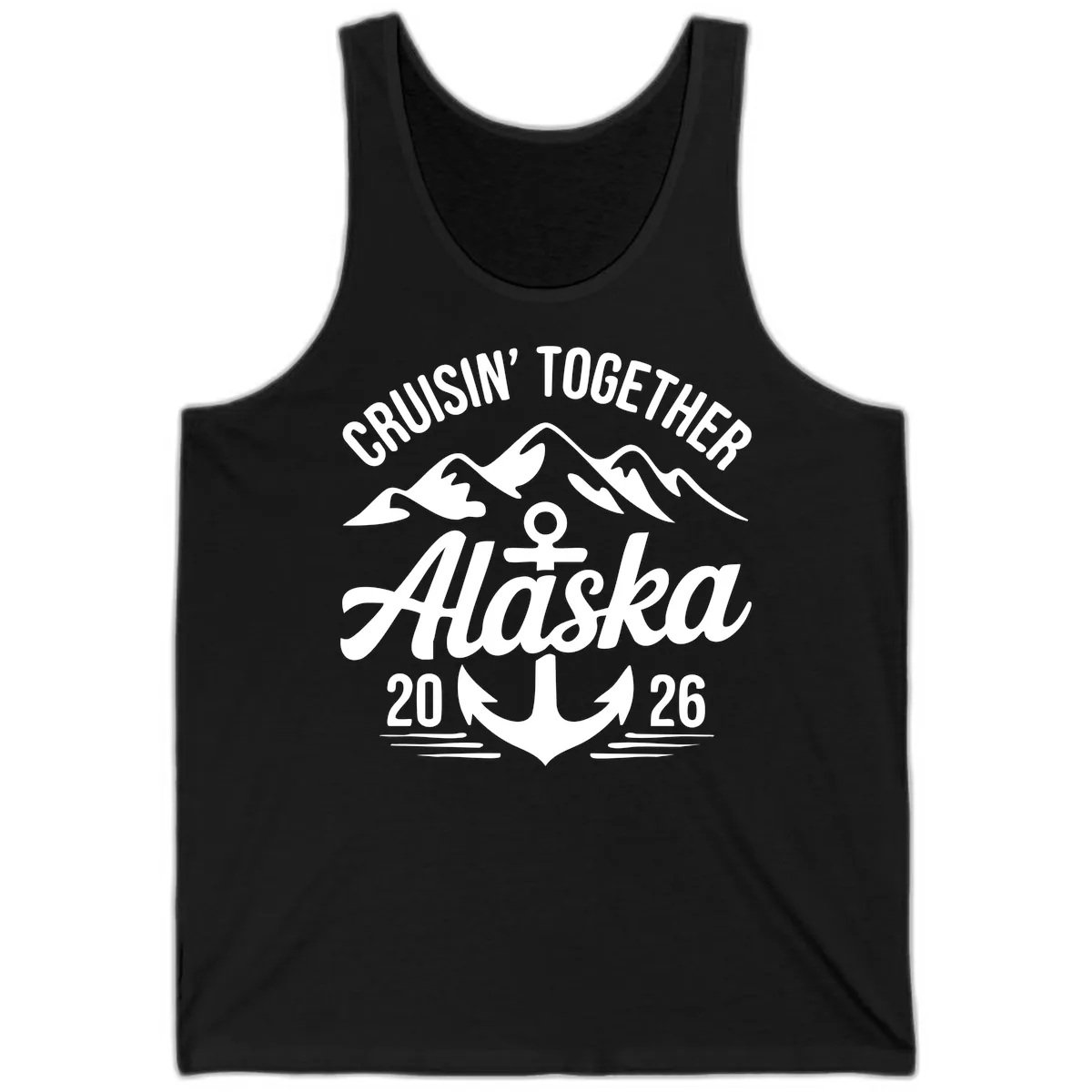 The 'CRUISIN' TOGETHER ALASKA 2026' text and the white anchor, wave, and mountain graphics are printed in white against the black tank top, providing a clear and stylish look.
