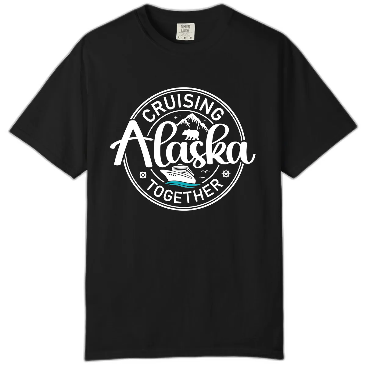 Get ready to make some memories with the Cruisin' Alaska Together Scenic Badge Comfort Color tee! This super-soft shirt features a fantastic circular badge design packed with Alaskan charm: soaring mountains, a cool bear, a majestic cruise ship on teal waves, and playful seagulls. It's the ultimate way for your crew to celebrate your shared journey through the stunning Last Frontier.