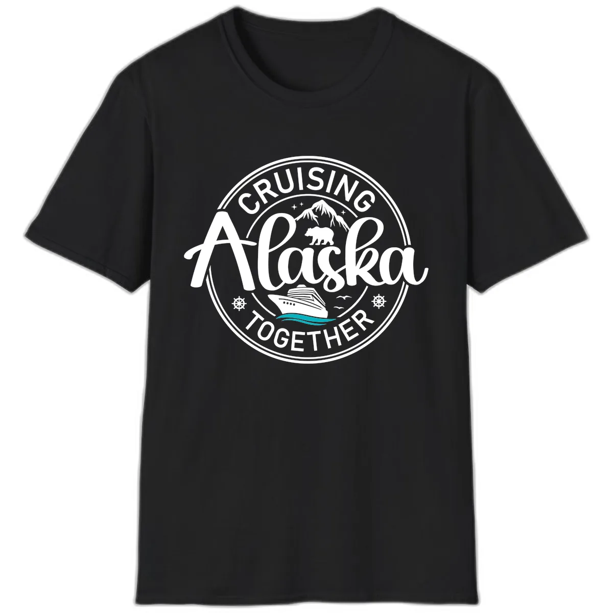 This classic unisex tee features a circular badge design with 'CRUISIN' ALASKA TOGETHER' text. It's adorned with charming illustrations of mountains, a bear, a cruise ship, seagulls, ship's wheels, and tree branches in white with teal wave accents.