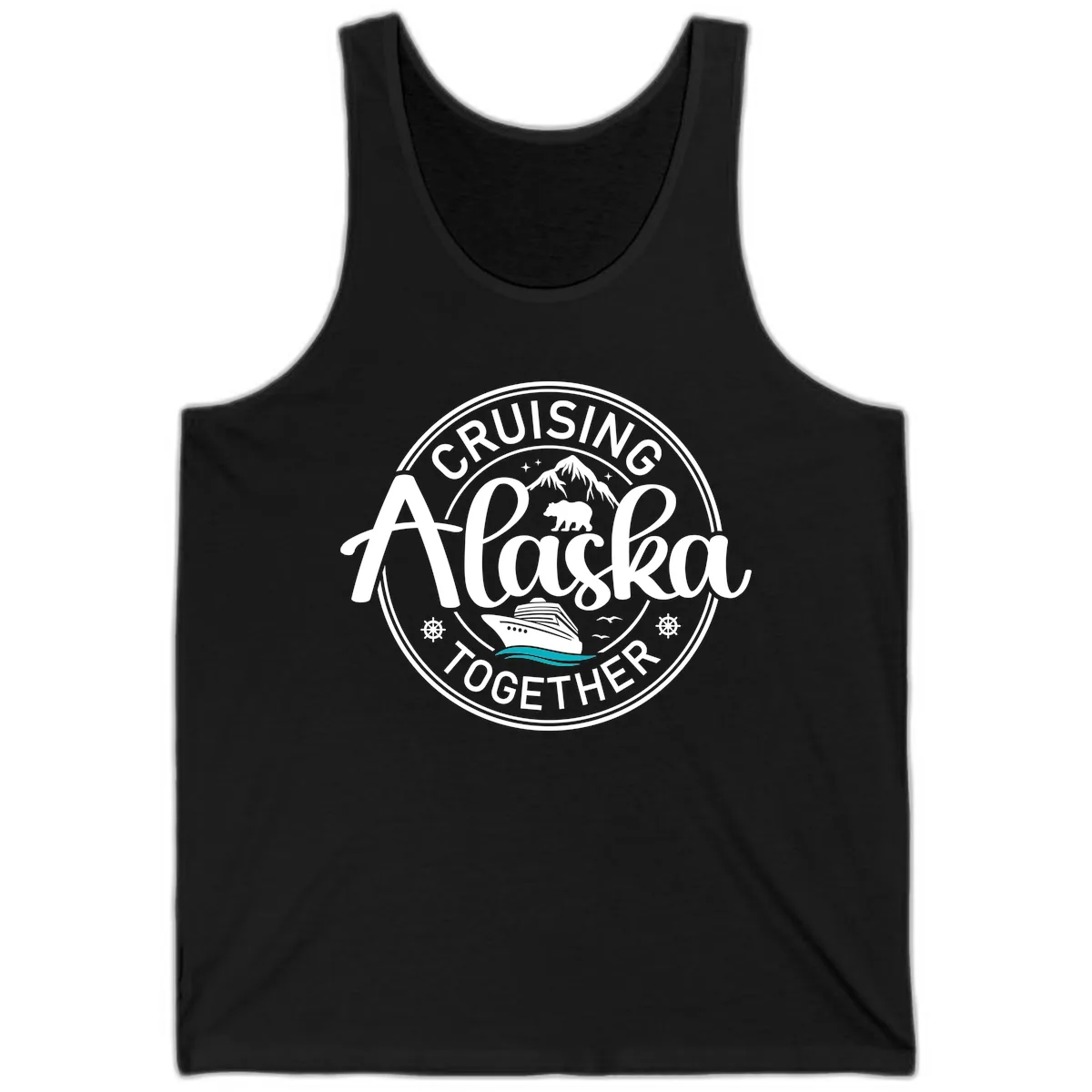 The circular scenic badge design, featuring 'CRUISIN' ALASKA TOGETHER' text along with mountains, a bear, and a cruise ship, is prominently displayed on the front of the tank.