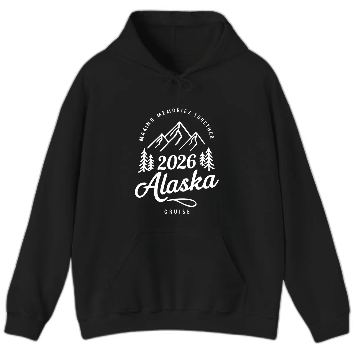 Yes, the striking 'MAKING MEMORIES TOGETHER 2026 Alaska CRUISE' design, featuring the mountain and pine tree line art, is printed clearly to be a focal point of the hoodie.