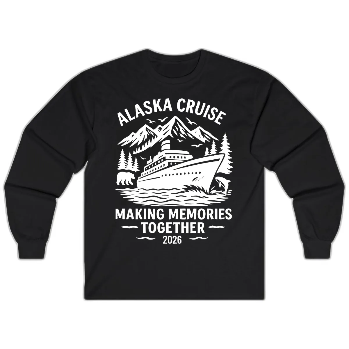 Embrace the spirit of adventure with the Alaska Cruise Making Memories Together 2026 Long Sleeve shirt! This design captures the awe-inspiring beauty of the Last Frontier, featuring majestic mountains, dense pine trees, a grand cruise ship sailing the waters, and iconic Alaskan wildlife like bears, birds, and dolphins. It's the perfect way to commemorate your 2026 voyage and the unforgettable moments you'll create together.