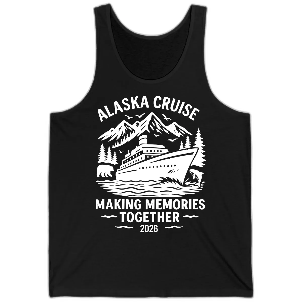 The tank features a detailed black and white illustration of an Alaskan landscape, including mountains, pine trees, a cruise ship, and wildlife like a bear, birds, and a dolphin. The text 'ALASKA CRUISE MAKING MEMORIES TOGETHER 2026' is clearly visible.
