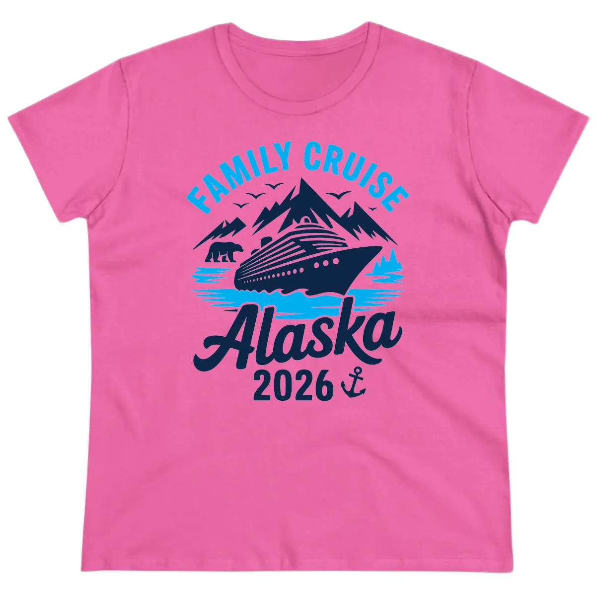 Embark on your Alaskan cruise with a touch of scenic beauty and family fun in our specially designed Family Cruise Alaska Mountain Scenic Ladies Tee. The bold 'FAMILY CRUISE' text gracefully arches over a captivating landscape of snow-capped mountains, lush evergreen forests, and serene ocean waters, rendered in beautiful blue and white silhouettes. It’s the perfect way for the ladies in the family to match and make lasting memories.
