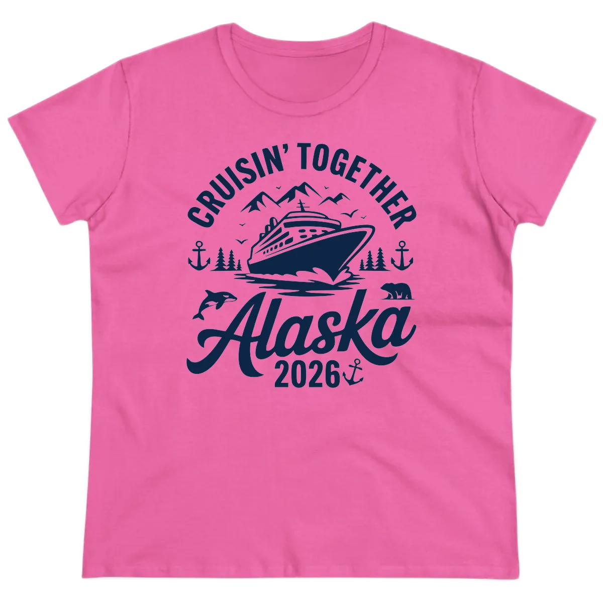 Set sail in style on your 2026 Alaska cruise with our "Cruisin' Together Alaska 2026" Ladies Tee! This shirt is designed to capture the magic of your adventure, featuring a beautiful illustration of a cruise ship amidst stunning Alaskan scenery, complete with snow-capped mountains, pine trees, and incredible wildlife like polar bears and orcas. It's the perfect way to commemorate your journey and match with your crew!