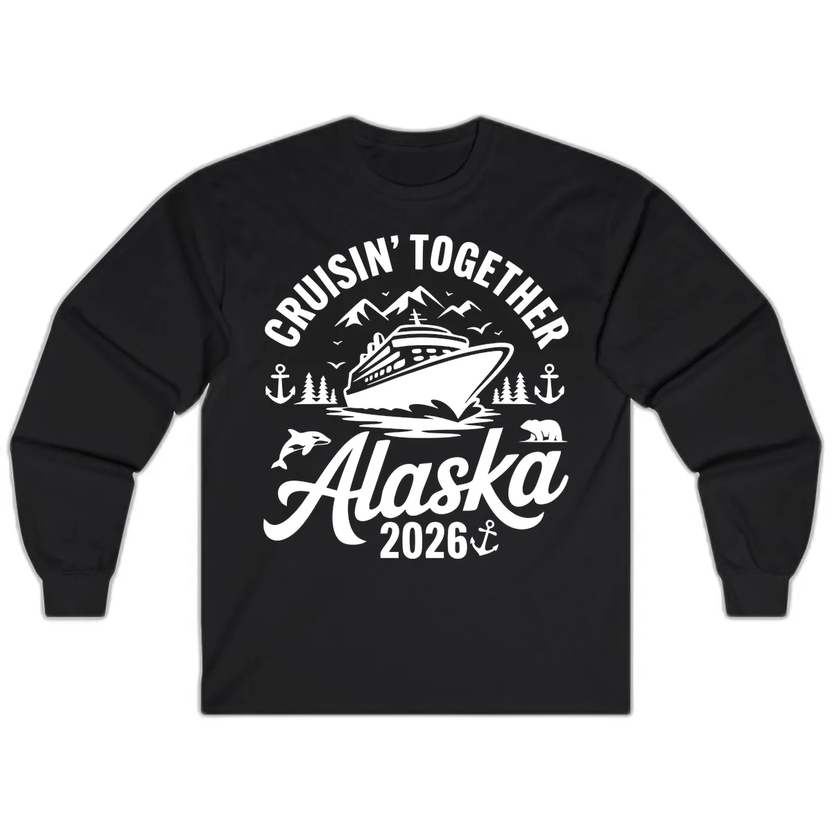 The design remains the same with 'CRUISIN', TOGETHER, Alaska, 2026' and the Alaskan scenery. The long sleeves simply provide extra coverage and warmth, making it more versatile for varying Alaskan weather.