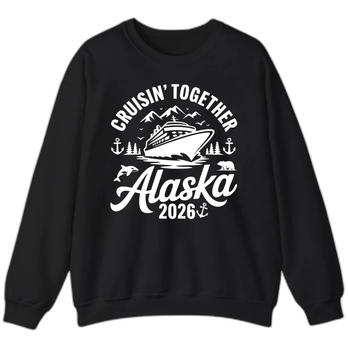 Gear up for your epic 2026 Alaska cruise with our "Cruisin' Together Alaska 2026" Sweatshirt! This cozy top features a stunning illustration of a magnificent cruise ship navigating the breathtaking Alaskan wilderness, complete with towering mountains, pine trees, and incredible wildlife like polar bears and orcas. It's the perfect way to stay warm while celebrating your group's unforgettable journey!