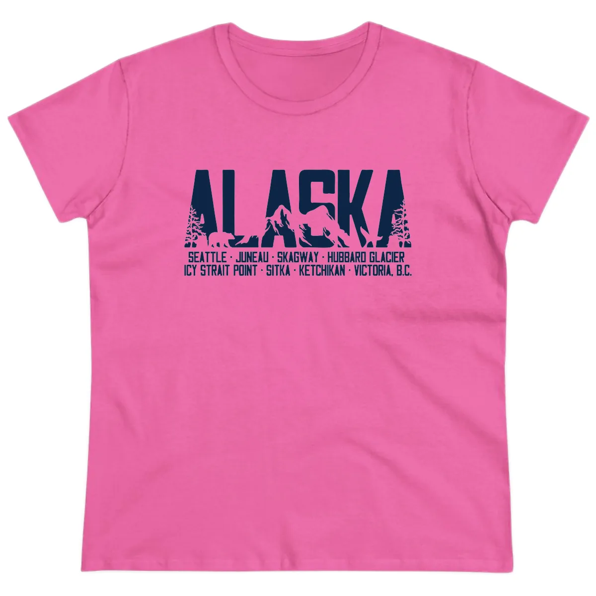 Sail through Alaska in style and comfort with this specially designed ladies' tee! The iconic "ALASKA" text is brought to life with a beautiful wilderness scene featuring pine trees, mountains, and a bear silhouette. Your entire cruise itinerary, from Seattle to Victoria, B.C., is listed below, making this tee a stylish reminder of your incredible adventure.