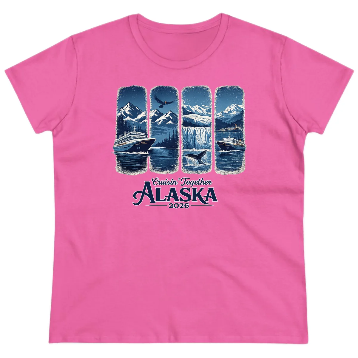 Ladies, get ready to sail through Alaska in style with this beautiful and scenic tee designed just for you! Our "Alaskan Cruise Together" design features captivating vertical panels showcasing the best of Alaska: majestic mountains, a grand glacier, a soaring eagle, and your cruise ship on the ocean. The "Cruisin' Together ALASKA 2026" text is perfect for you and your favorite shipmates to commemorate your unforgettable journey.
