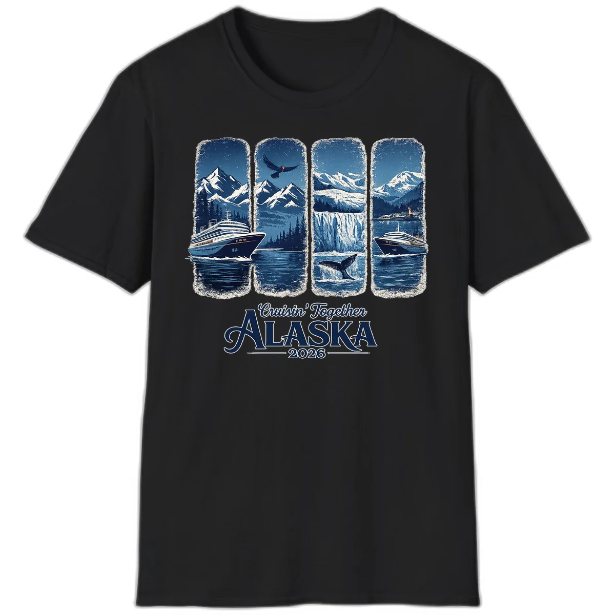 This T-shirt design showcases four vertical panels depicting iconic Alaskan sights, including cruise ships, snow-capped mountains, a soaring eagle, a majestic glacier with a whale tail, and a charming waterfront town. The text 'Cruisin' Together ALASKA 2026' is prominently displayed below these scenic panels.