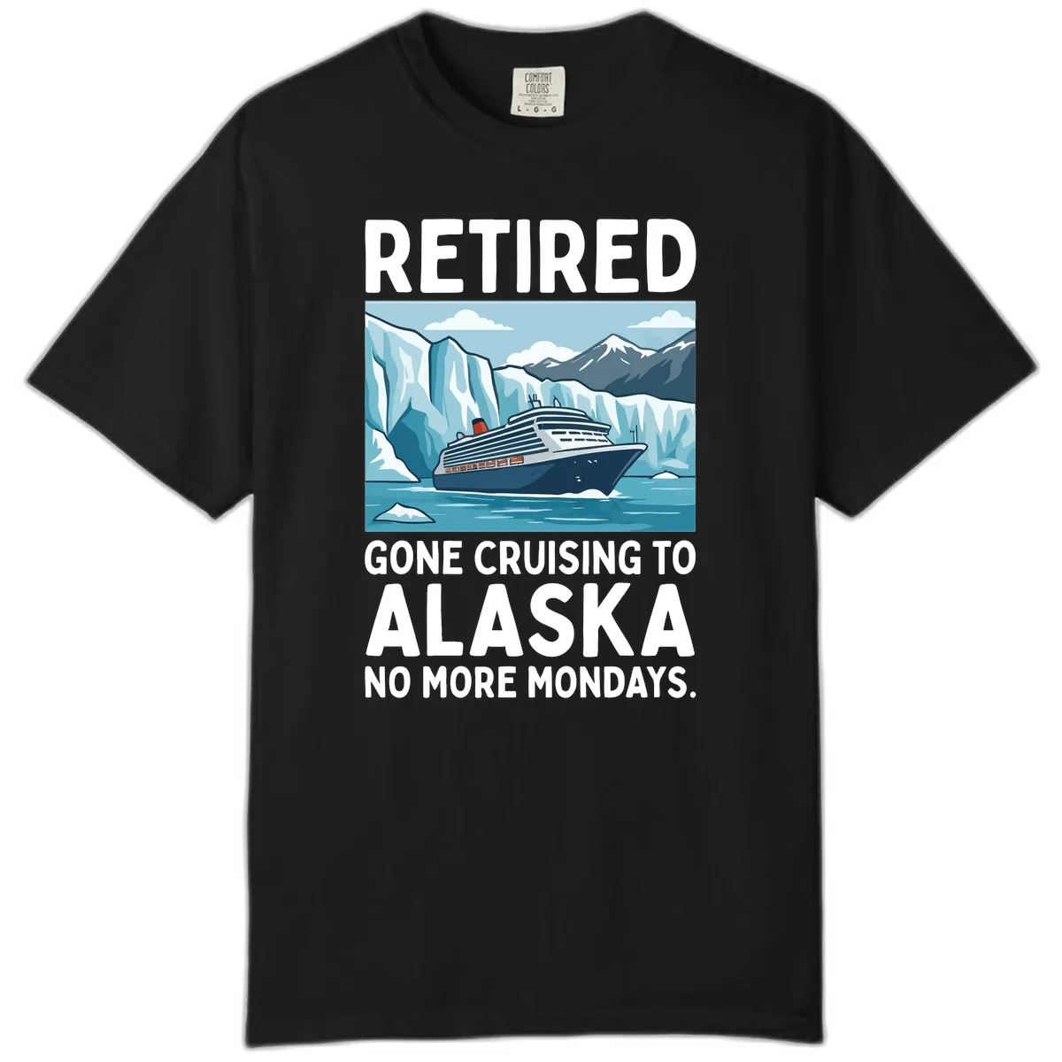 The unique, slightly washed-out look of Comfort Colors fabric complements the illustrated design, giving the 'RETIRED GONE CRUISING TO ALASKA NO MORE MONDAYS' graphic a vintage charm.