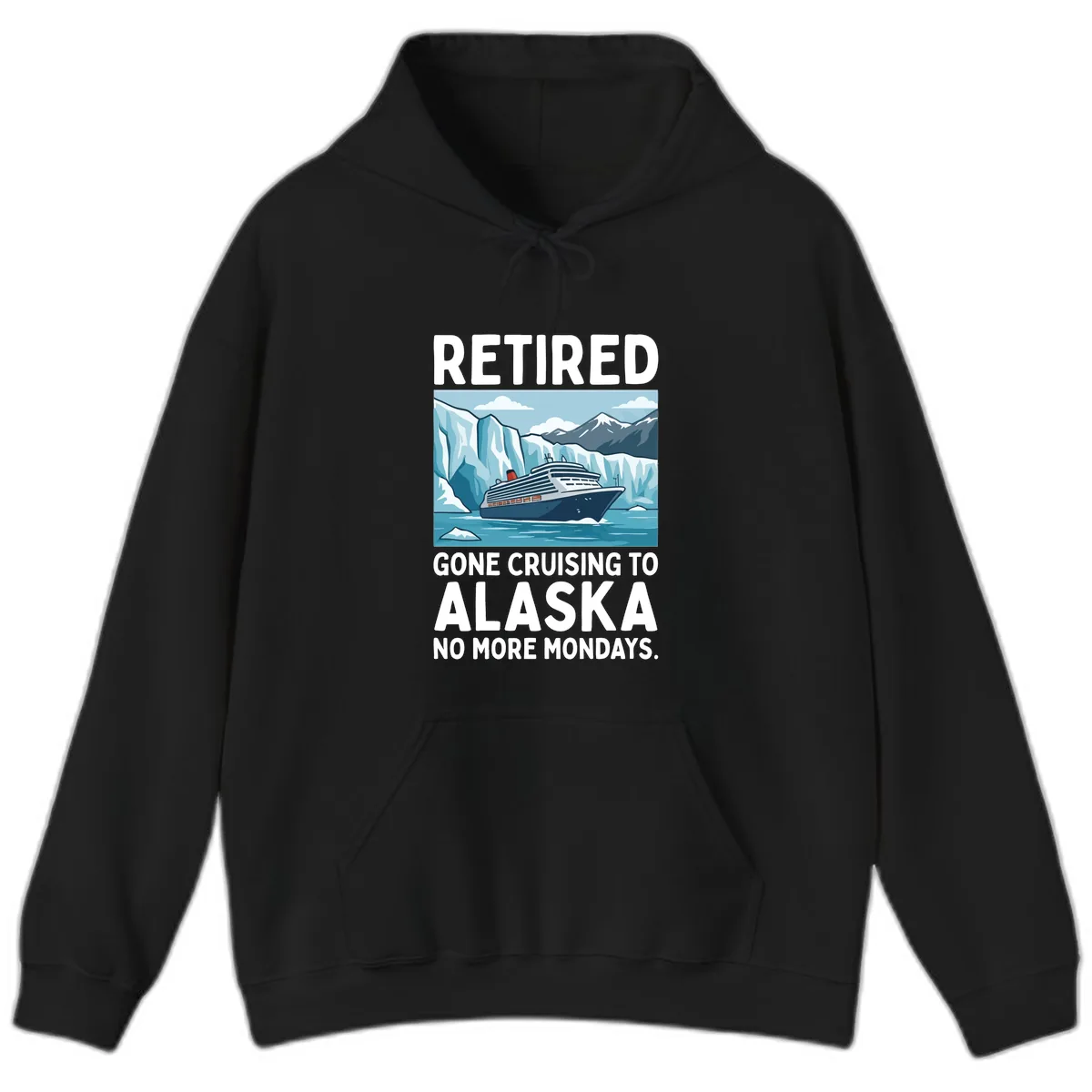 Your retirement adventure just got cozier! This "Retired Gone Cruising to Alaska No More Mondays" Hoodie is your ultimate companion for embracing freedom and exploring the Last Frontier. Featuring a striking illustration of a majestic cruise ship sailing through icy Alaskan waters, surrounded by glaciers and snow-capped mountains, it’s a wearable declaration of your new lifestyle. Say goodbye to deadlines and hello to breathtaking views – and definitely no more Mondays!