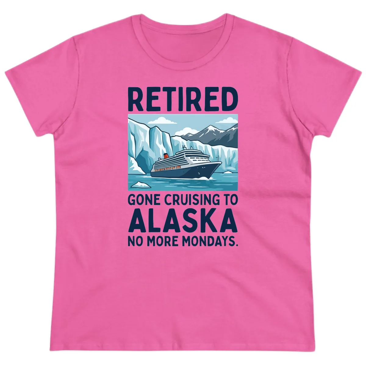 Ladies, it's time to trade boardrooms for glaciers! This "Retired Gone Cruising to Alaska No More Mondays" Ladies Tee is designed for the fabulous retiree embarking on an unforgettable Alaskan journey. The charming design features a beautiful cruise ship sailing through icy landscapes, complete with majestic mountains and glaciers. It’s the perfect way to celebrate your freedom and your stunning new itinerary – one that definitely doesn’t include Mondays!