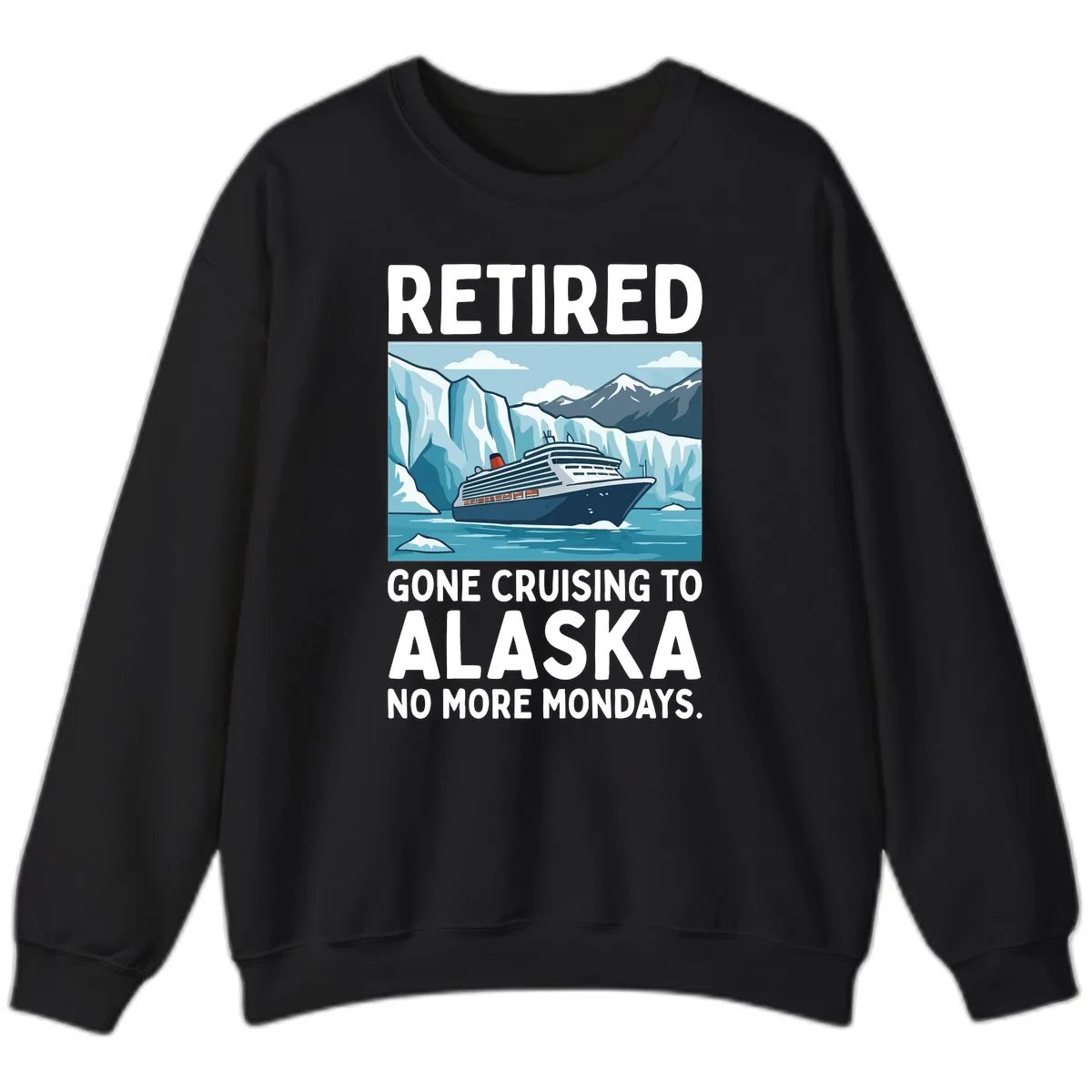 Get ready to cozy up and celebrate your retirement in ultimate style with this "Retired Gone Cruising to Alaska No More Mondays" Sweatshirt! This super-soft sweatshirt features a stunning illustration of a grand cruise ship navigating the breathtaking Alaskan landscape, complete with icy glaciers and majestic snow-capped mountains. It’s the perfect blend of warmth, comfort, and a bold declaration that your days of Monday dread are officially over. Welcome to your life of adventure!