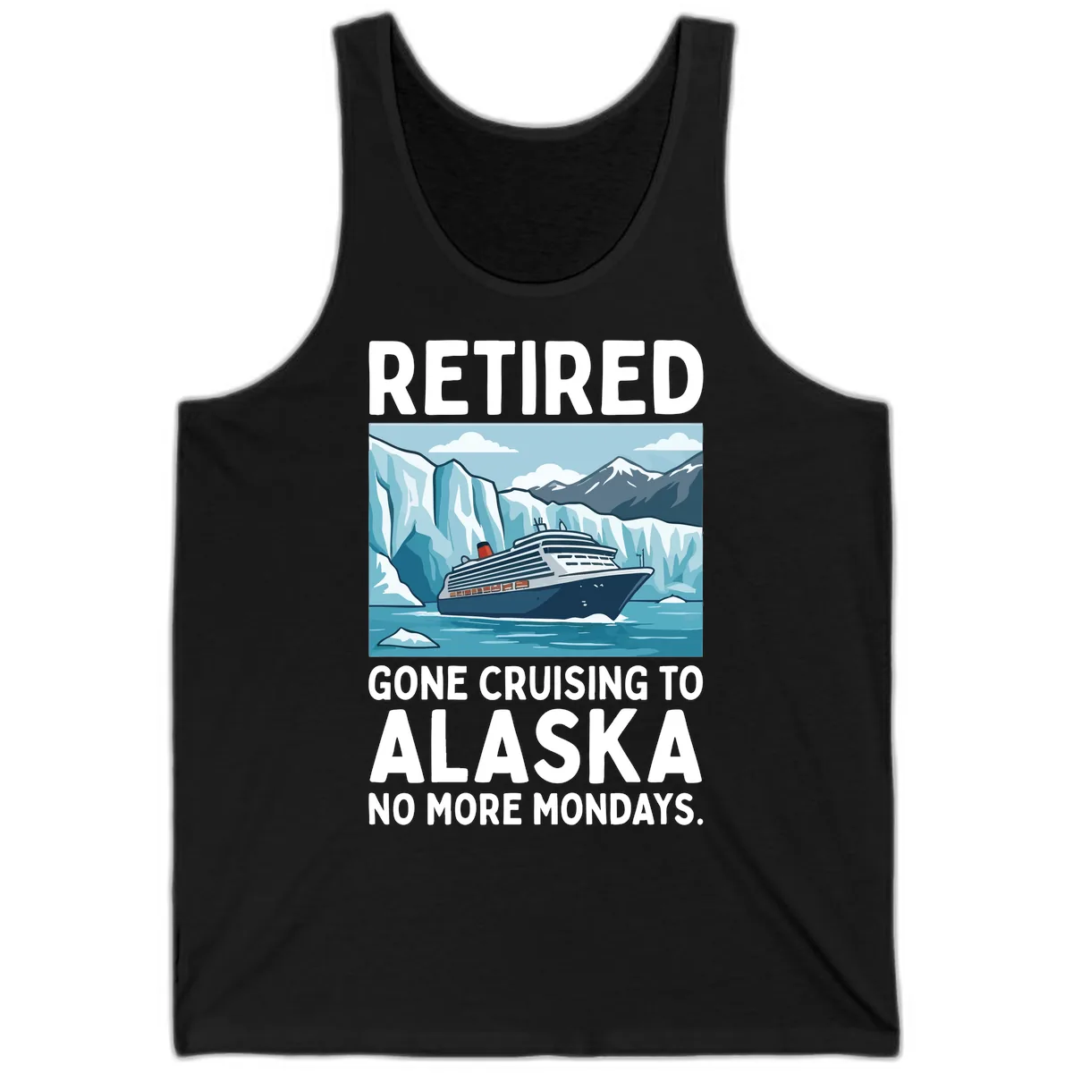 Soak up the sun (and the stunning Alaskan views!) in this "Retired Gone Cruising to Alaska No More Mondays" Tank Top. Designed for ultimate comfort and vacation vibes, it features a fantastic illustration of a cruise ship navigating icy Alaskan waters, surrounded by glaciers and mountains. This tank is your perfect partner for celebrating retirement and embracing a life free from weekday worries. Say hello to adventure, Alaska-style!
