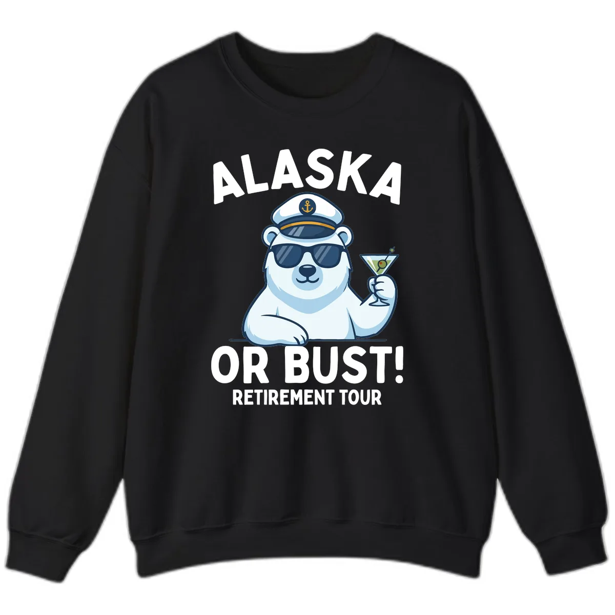 Don't let the Alaskan chill dampen your retirement spirit! This "Alaska Or Bust!" crewneck sweatshirt is your cozy companion for an unforgettable cruise. Featuring our iconic polar bear captain, martini in hand and shades on, it’s the perfect blend of humor, comfort, and celebration. Embrace your freedom and make lasting memories on your retirement adventure in true style!