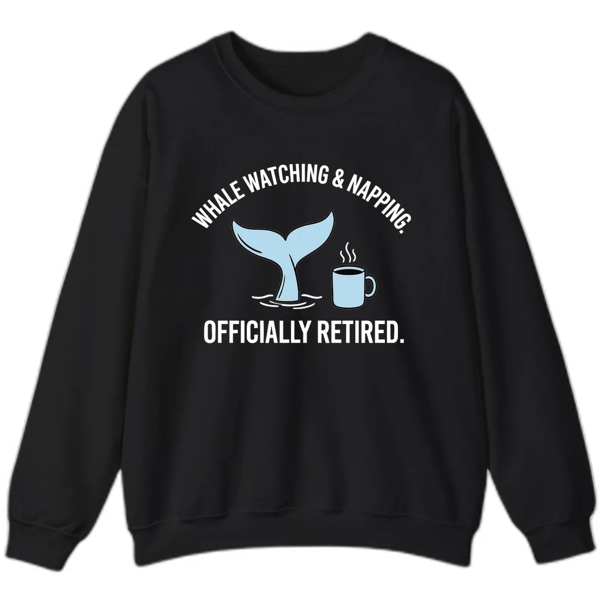 - ✓ Humorous 'WHALE WATCHING & NAPPING. OFFICIALLY RETIRED.' text.