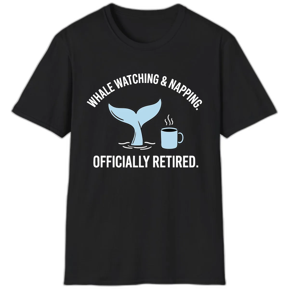 This t-shirt features the 'Whale Watching & Napping. Officially Retired.' design, celebrating your newfound freedom to enjoy leisure activities like whale watching and relaxing with a coffee.
