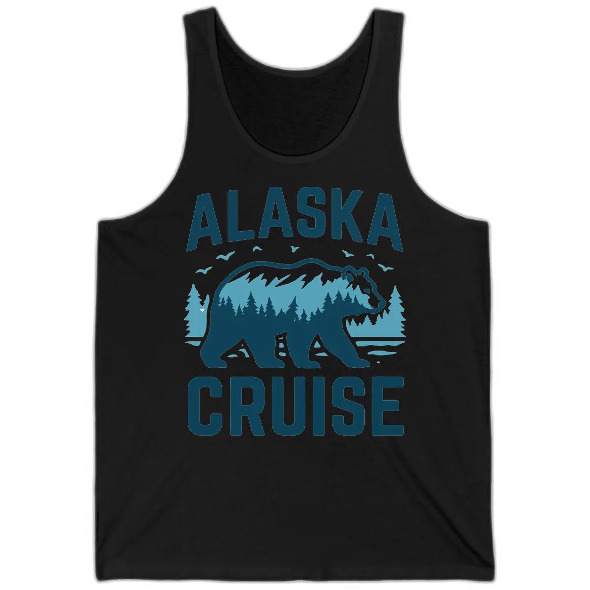 The stunning illustration, featuring the grizzly bear silhouette filled with mountains and trees, along with the 'ALASKA' and 'CRUISE' text, is printed clearly on this lightweight tank.