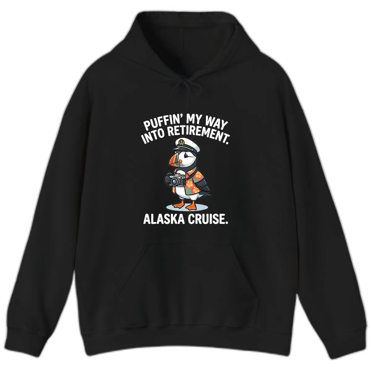 The front of the hoodie prominently displays the 'PUFFIN' INTO MY RETIREMENT. ALASKA CRUISE.' text and the fun illustrated puffin captain with his camera and Hawaiian shirt.