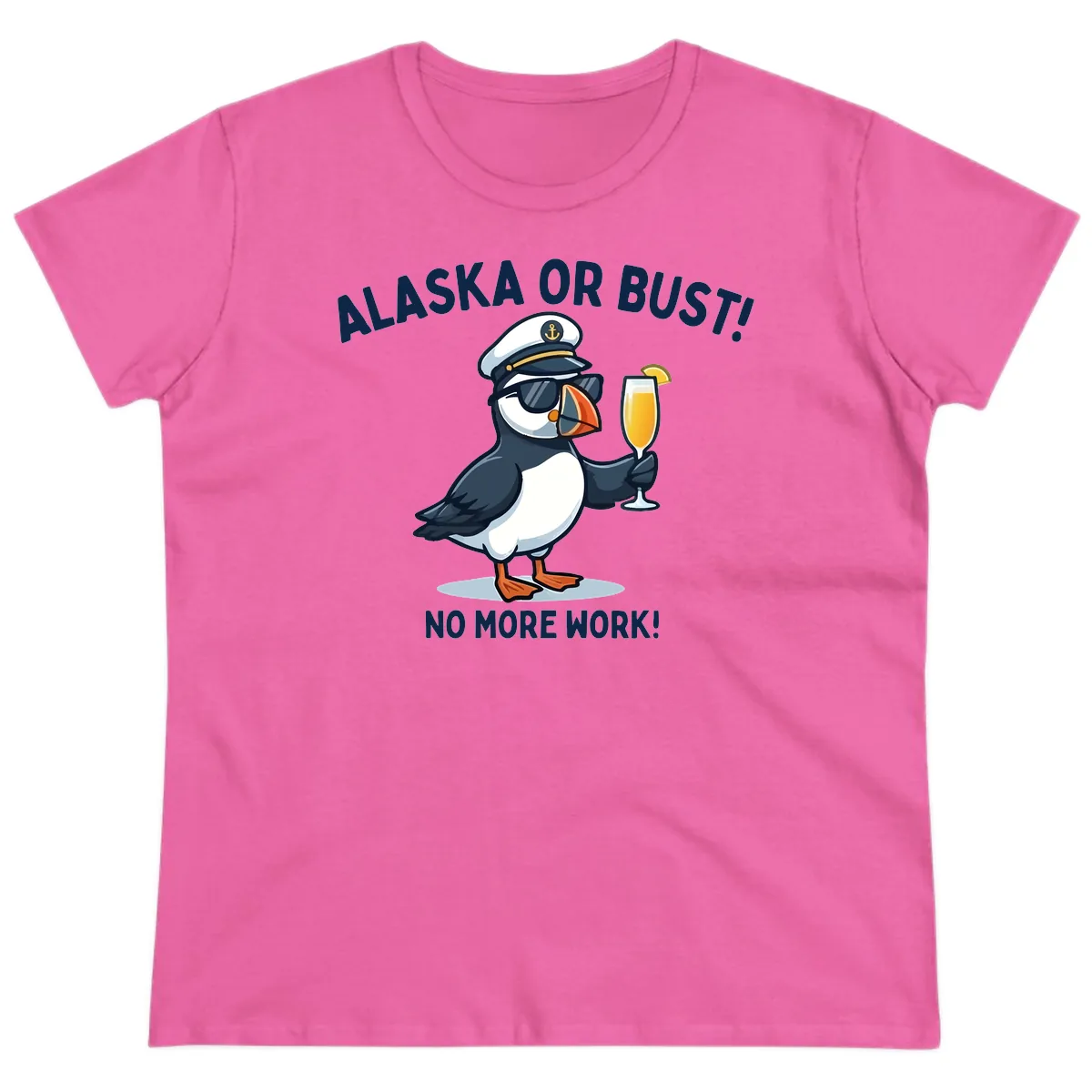 Ladies, get ready to set sail in style! Our "Alaska or Bust Captain Puffin" tee is designed just for you, featuring a cool puffin captain ready to toast your adventure with 'ALASKA OR BUST!' and 'NO MORE WORK!' This is your go-to shirt for embracing that vacation state of mind.