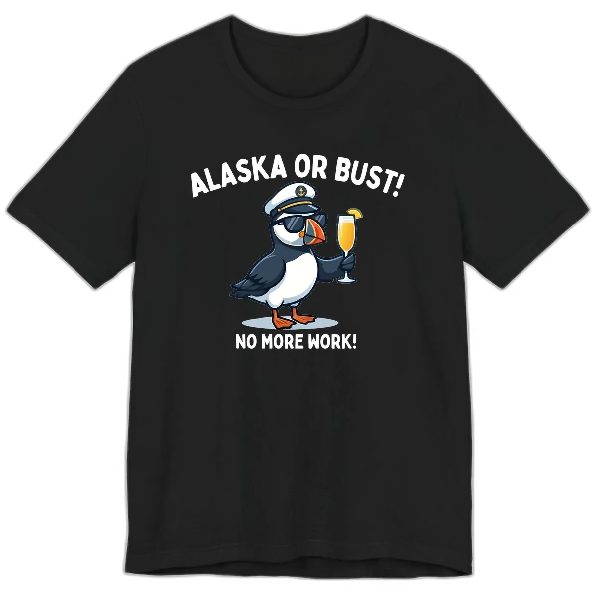 This isn't just any tee; it's your passport to pure vacation bliss! Featuring a charismatic puffin captain rocking shades and a cocktail, this premium shirt proudly declares 'ALASKA OR BUST!' and 'NO MORE WORK!' Get ready to make a statement and soak in the Alaskan wonders.