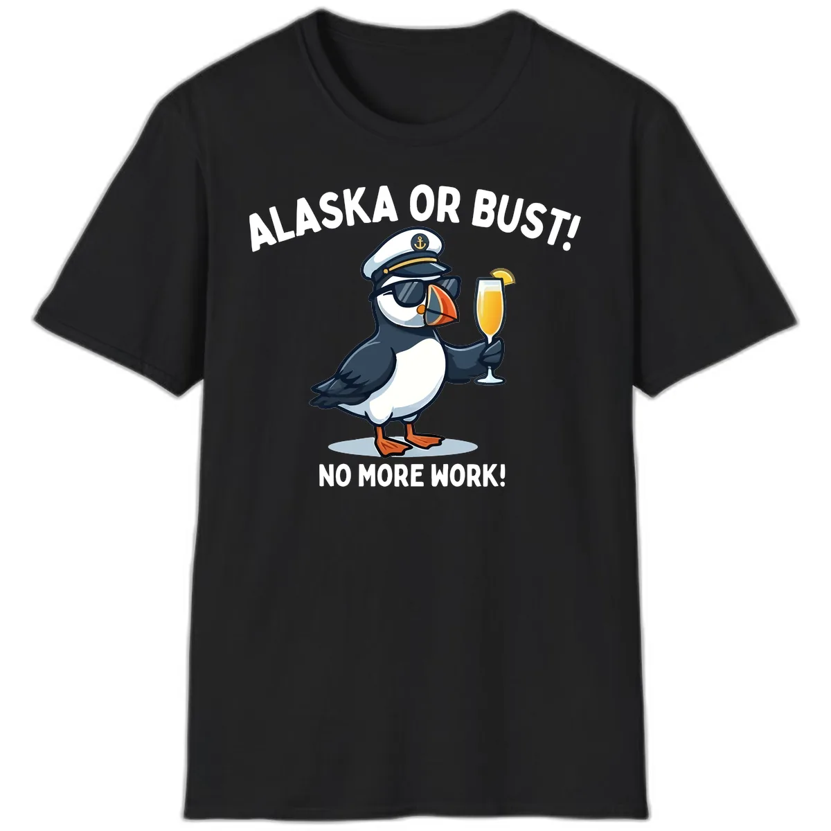 Ready to trade spreadsheets for sea spray? Our "Alaska or Bust Captain Puffin" tee features a dapper puffin captain, cocktail in hand, ready to shout 'ALASKA OR BUST!' and 'NO MORE WORK!' for your epic adventure. This shirt is your official uniform for vacation mode.