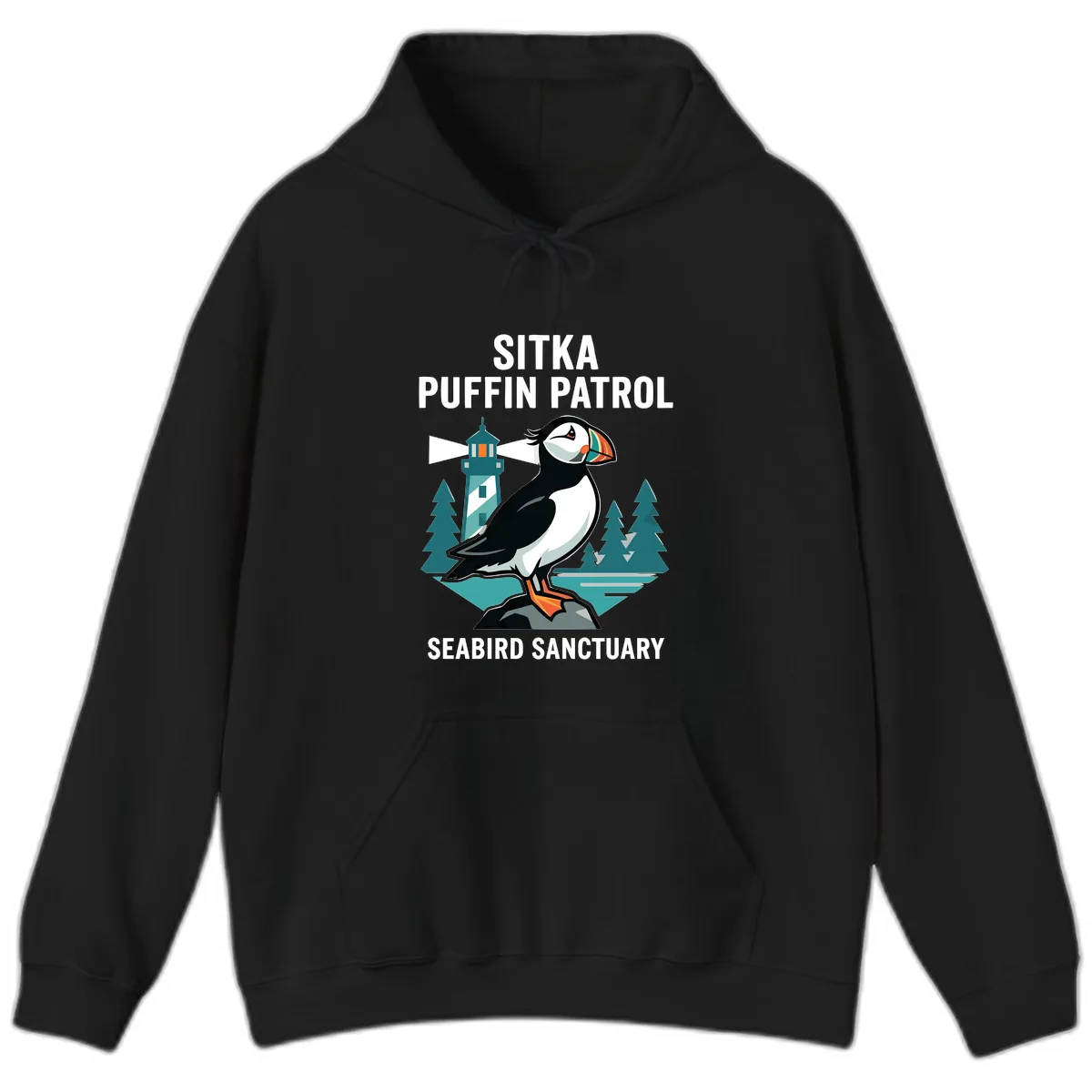The 'Sitka Puffin Patrol Seabird Sanctuary Adventure' design is prominently featured on the hoodie, ensuring the vibrant puffin, lighthouse, and text details are clearly visible. It's a fun way to represent your trip.