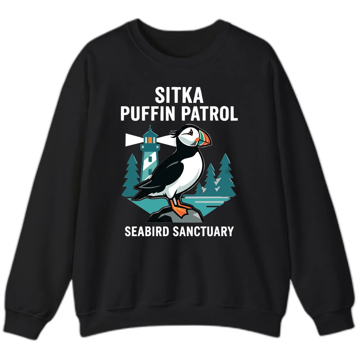 The 'Sitka Puffin Patrol Seabird Sanctuary Adventure' design is printed clearly on the sweatshirt, making the puffin, lighthouse, and text details stand out. It's a great way to showcase your Alaskan adventure.