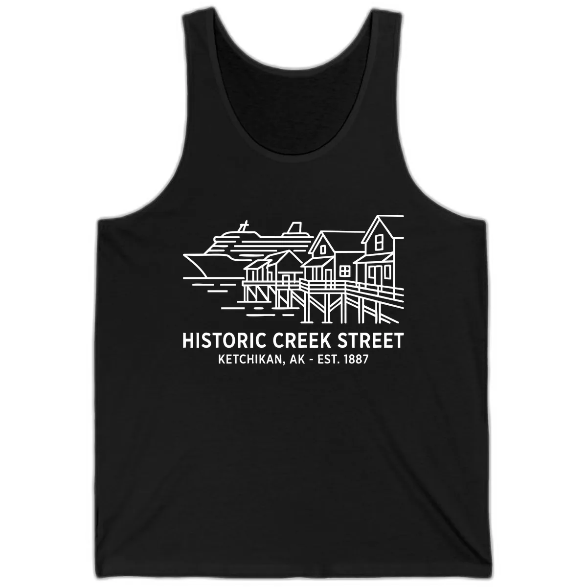 The white line art illustration of Historic Creek Street, Ketchikan, including the cruise ship, waterfront buildings, and bridge, is clearly printed on the front of the tank, making it a stylish visual.