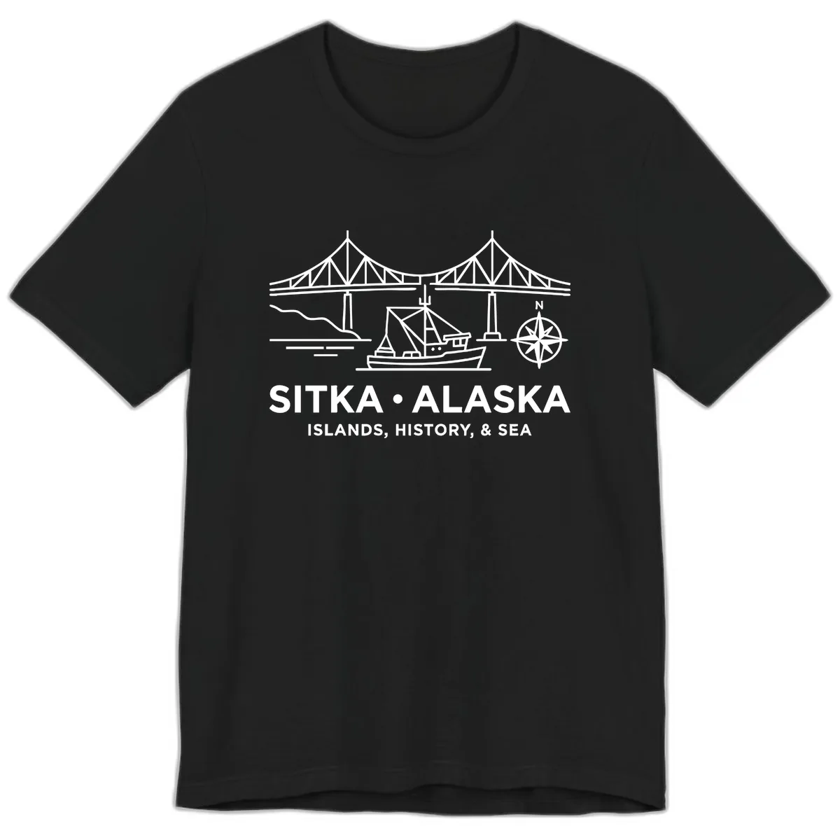 - ✓ Intricate white line art of Sitka's bridge, boat, and compass rose.