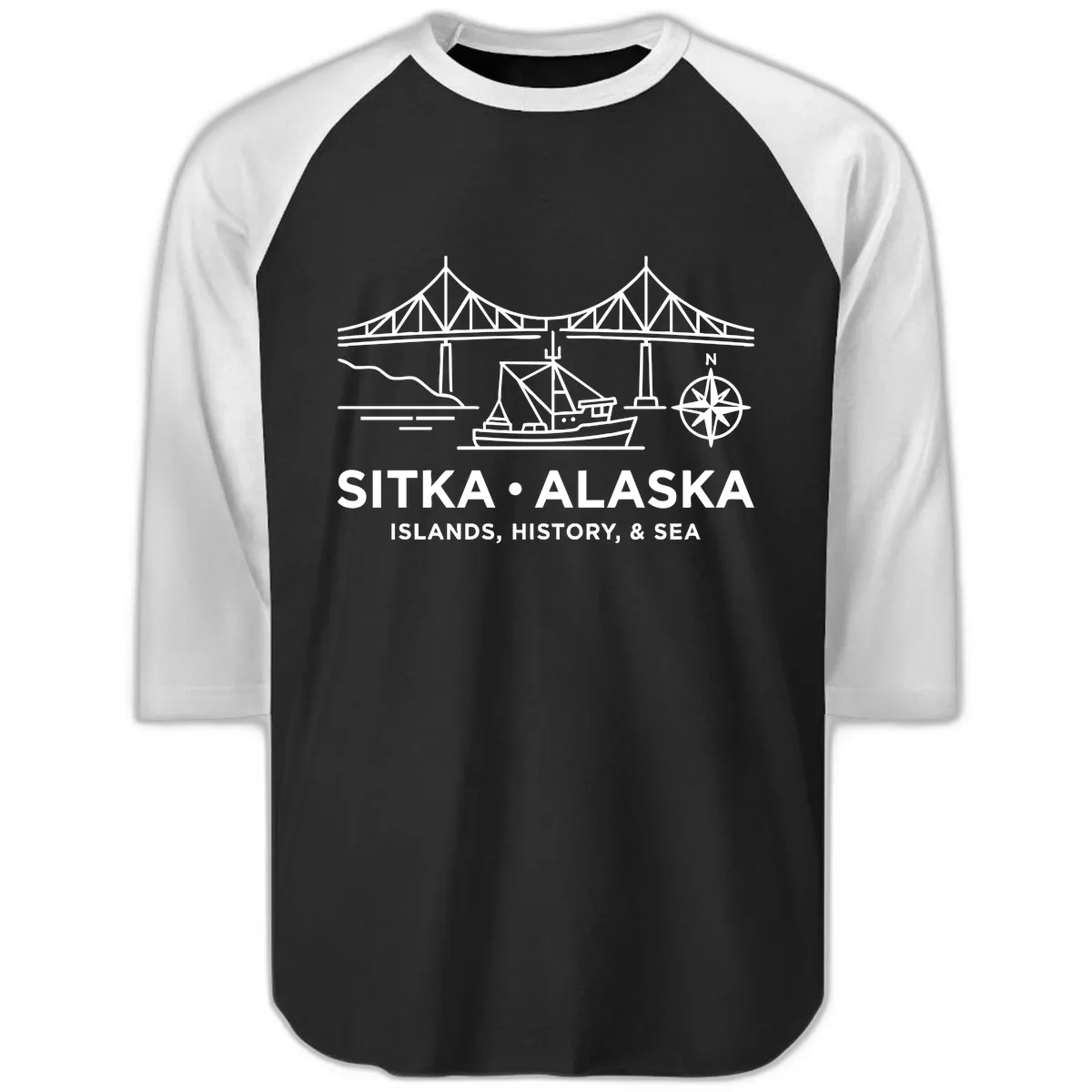 The detailed white line art illustration of the Sitka bridge, fishing boat, and compass rose, along with the text 'SITKA ALASKA ISLANDS, HISTORY, & SEA', is featured on the chest of this Raglan 3/4 sleeve tee, making it a stylish focal point.