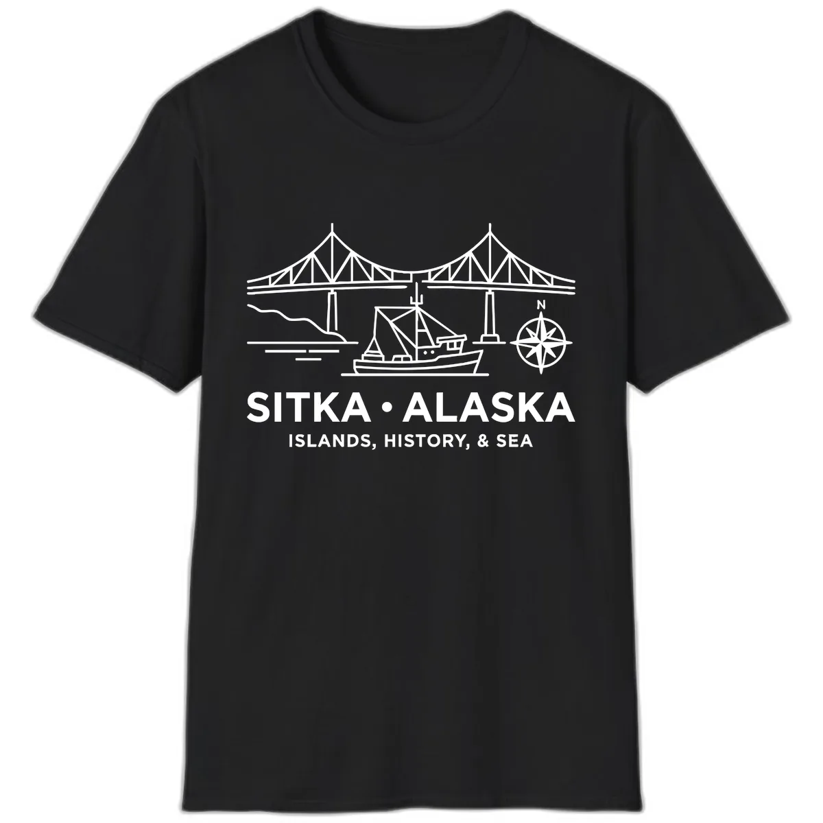 This T-shirt features a white line art illustration that includes a detailed truss bridge, a fishing boat, and a compass rose. The design is complemented by the text 'SITKA ALASKA ISLANDS, HISTORY, & SEA' below the graphics.