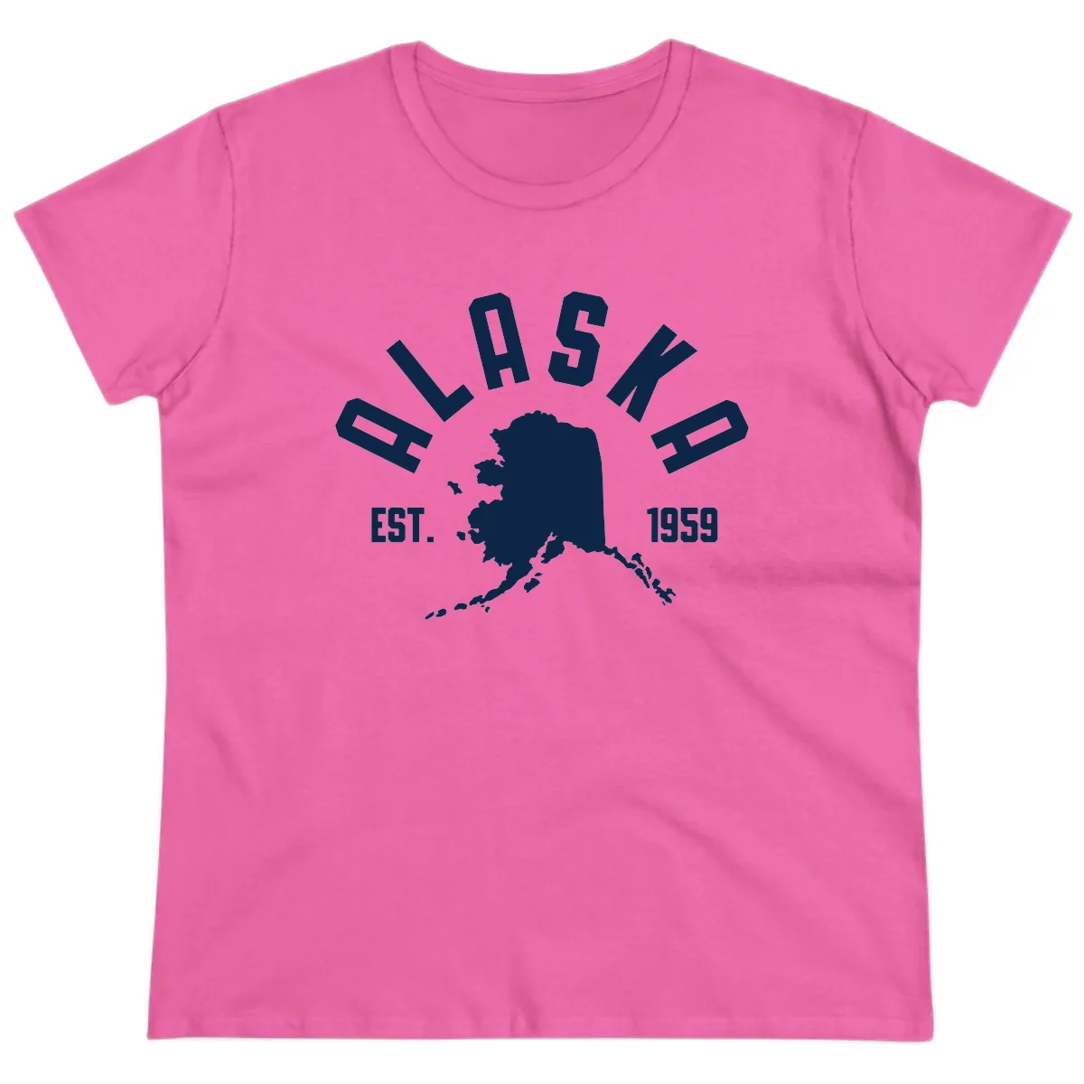 Cruise in style with this flattering ladies' tee! It showcases a striking "ALASKA EST. 1959" design against a detailed white silhouette map of the Last Frontier. This tee is the perfect blend of fashion and function, celebrating Alaska's statehood with a touch of wanderlust.