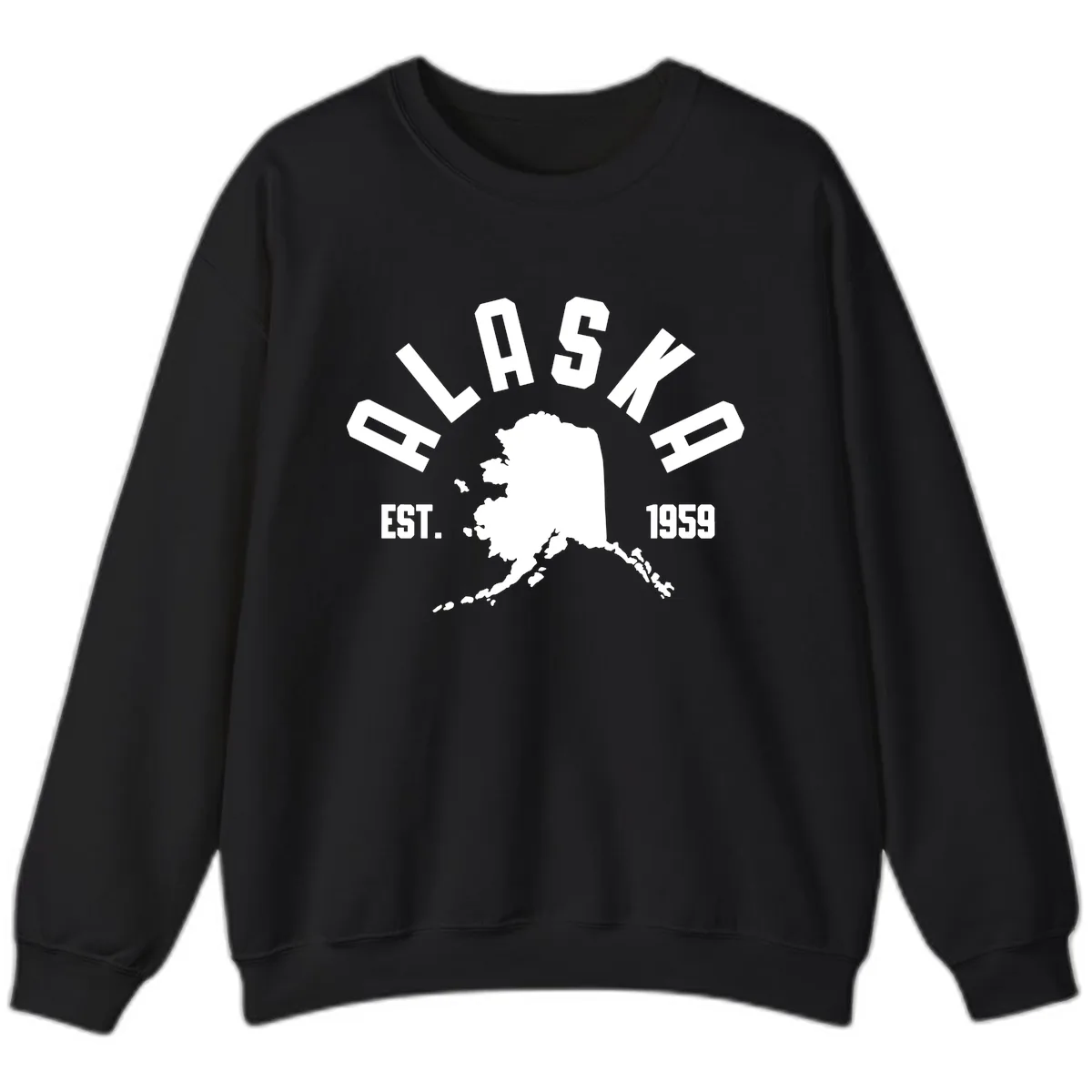 Keep the Alaskan chill at bay while staying in cruise mode with this super comfy sweatshirt! It proudly displays the "ALASKA EST. 1959" text layered over a crisp white silhouette map of the Last Frontier. This design is your perfect companion for celebrating statehood and making lasting memories on your adventure.