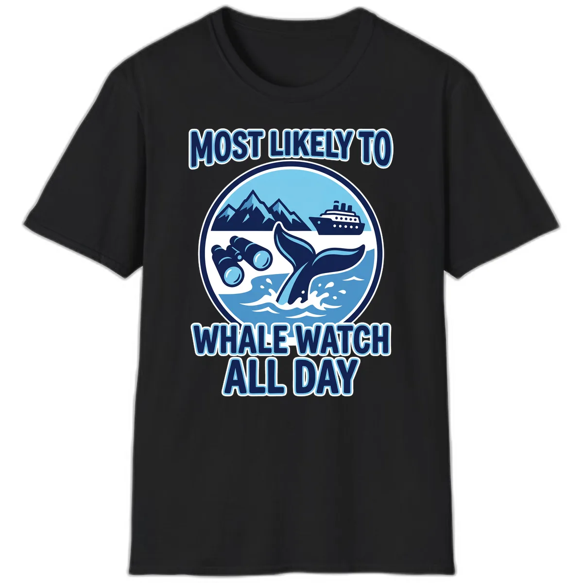 - ✓ Fun 'Most Likely To Whale Watch All Day' illustrated design