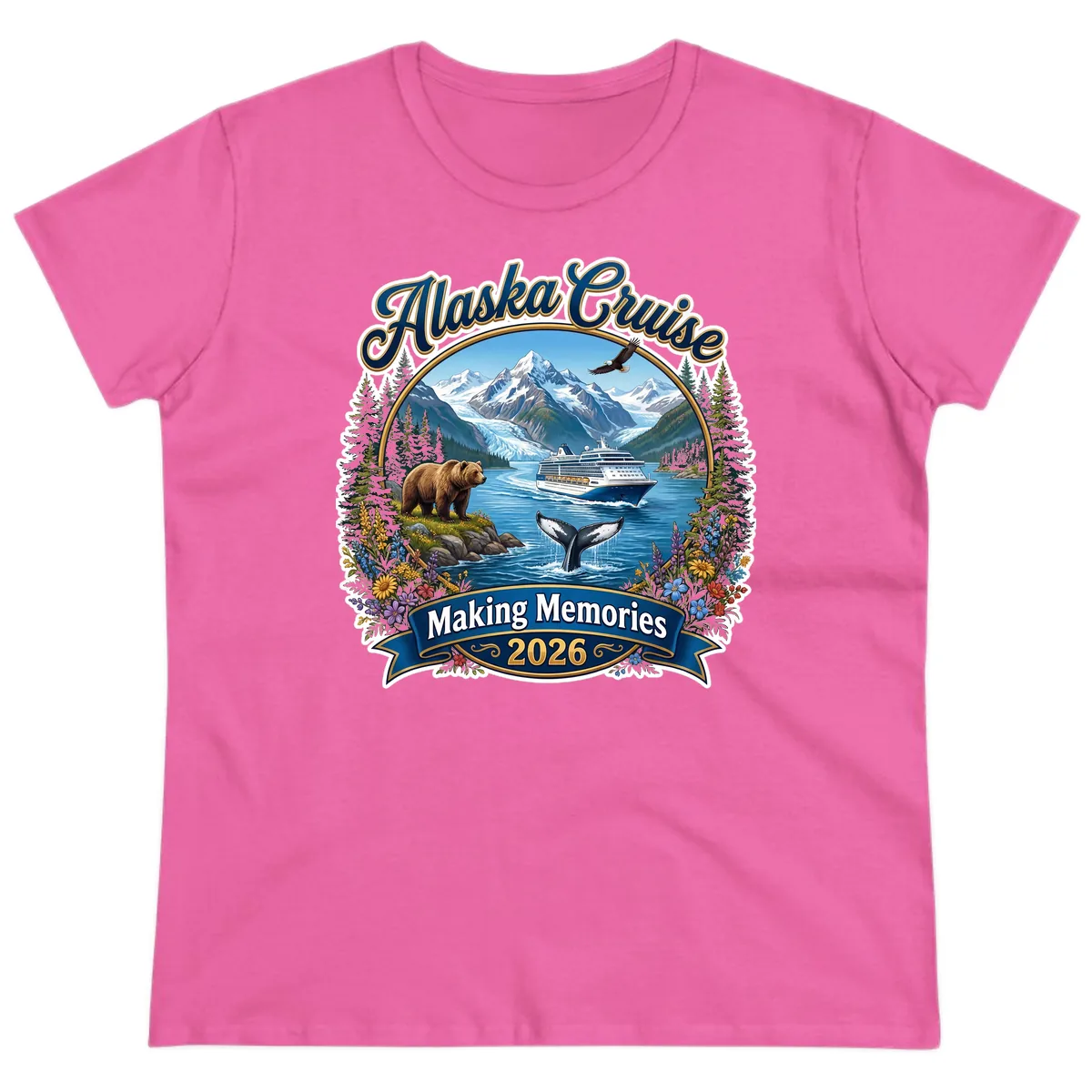 Capture the magic of your 2026 Alaskan voyage with this stunning Ladies Tee! Designed to flatter, this tee showcases a breathtaking scene of your cruise ship navigating pristine waters, surrounded by majestic glaciers, snow-capped mountains, and iconic wildlife. It's the perfect way for ladies to remember their incredible journey through the Last Frontier with style and comfort.