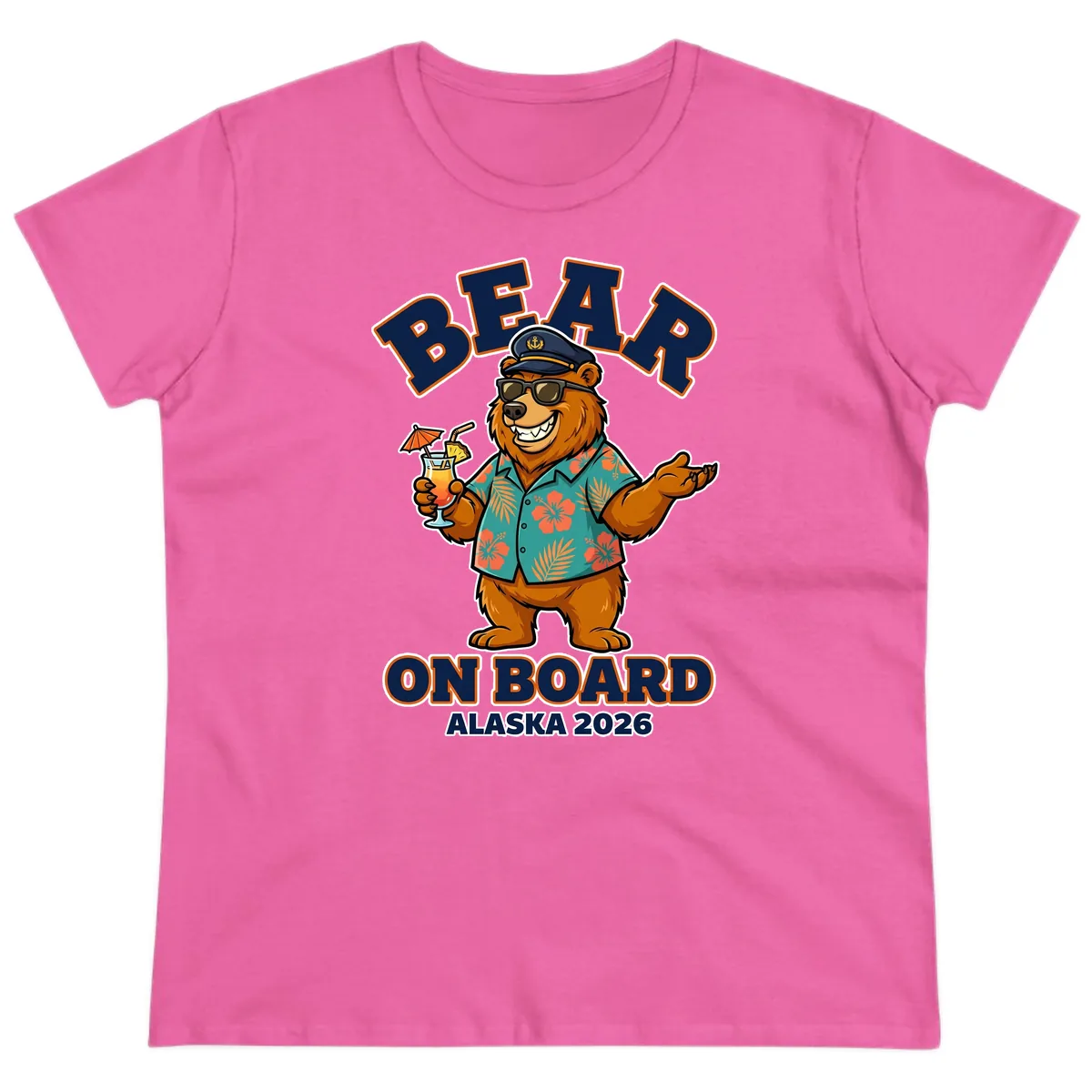 Get ready to set sail for adventure with our 'Bear On Board Alaska 2026' ladies' tee! This design features a super fun cartoon bear, complete with a captain's hat, cool sunglasses, and a colorful Hawaiian shirt, all while sipping on a tropical drink. It’s the perfect blend of cute, funny, and cruise-ready style, designed to make you smile every time you wear it on your 2026 Alaska vacation.