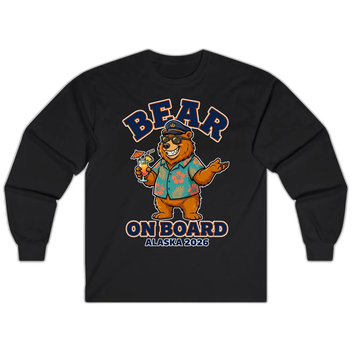 Embrace the spirit of adventure with our 'Bear On Board Alaska 2026' long sleeve tee! This design features a delightful cartoon bear captain, complete with sunglasses and a tropical shirt, happily holding a pineapple drink. It’s the perfect blend of fun, comfort, and Alaska cruise flair, designed to keep you comfortable whether you're enjoying the sea breeze or exploring the Last Frontier. Get ready to make some unforgettable memories in 2026!