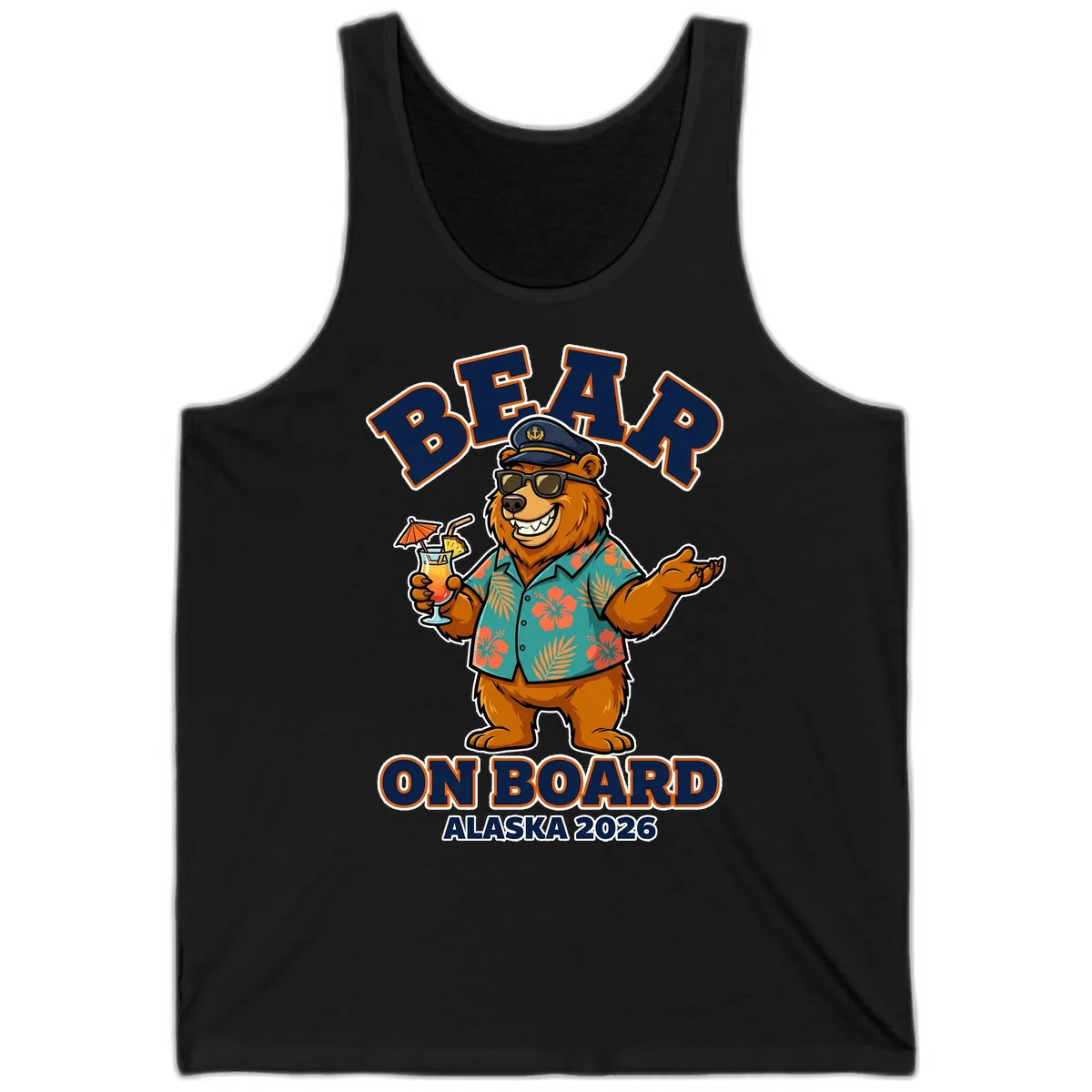 The 'Bear On Board Alaska 2026' graphic is printed vibrantly on this tank, showcasing the fun cartoon bear captain and tropical drink design. It's a playful addition to your cruise wardrobe.