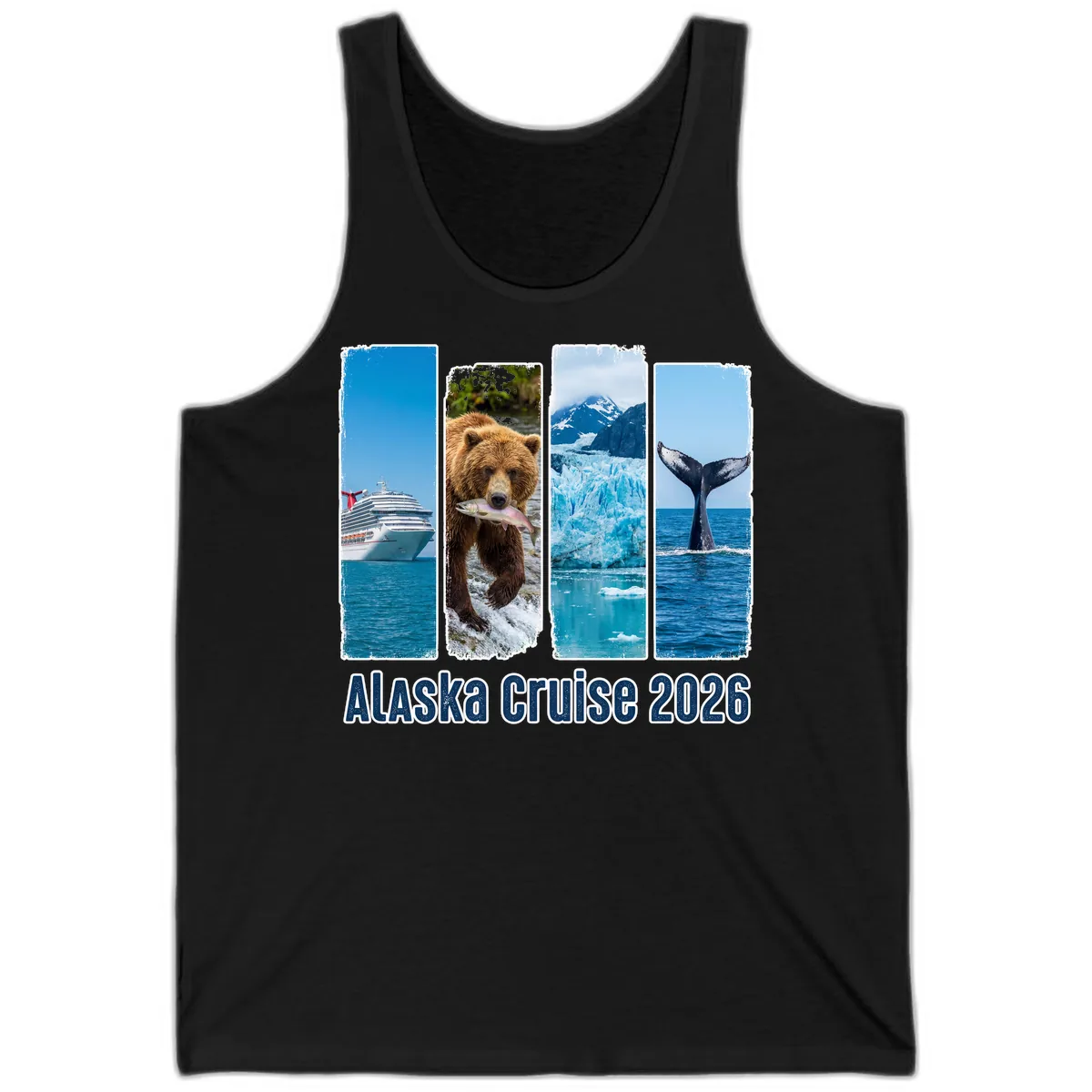 Soak up the Alaskan sun (when you can find it!) with our Adventure Panels Tank Top, designed for your 2026 cruise! This breezy tank features a vibrant collage of Alaska's most iconic sights across four panels: a majestic cruise ship, a powerful grizzly bear, a stunning glacier, and a playful whale tail. The "Alaska Cruise 2026" text makes it the perfect memento of your incredible adventure. Lightweight and comfortable, it’s your go-to for warm days on deck!