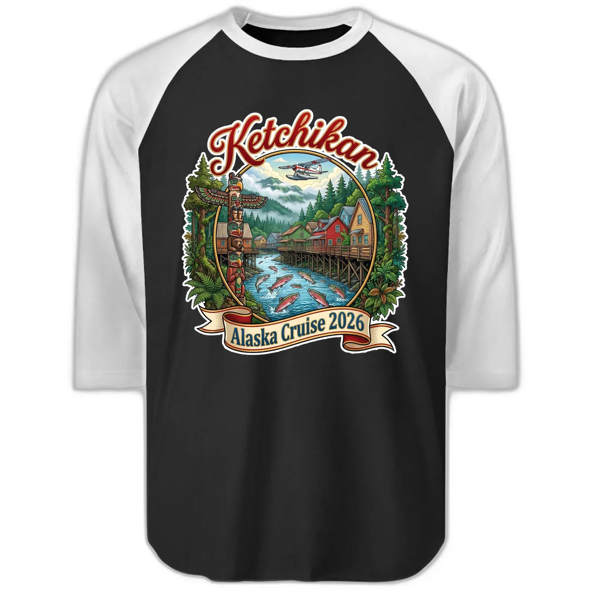 Add a touch of retro flair to your Alaska Cruise 2026 wardrobe with this stylish Ketchikan 3/4 sleeve raglan tee! The dynamic circular illustration showcases the best of the 'First City': a striking totem pole, colorful stilt houses, abundant salmon, and a vintage seaplane against a backdrop of misty mountains. It’s the perfect blend of classic style and Alaskan adventure.