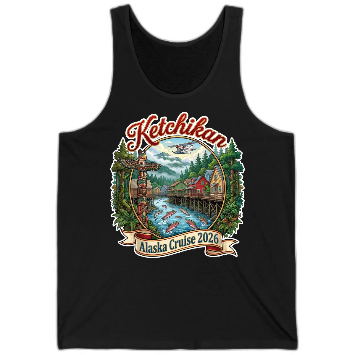The design incorporates 'Ketchikan' arched above the graphic and 'Alaska Cruise 2026' on a banner below, ensuring these key cruise details are easily seen on your stylish tank top.